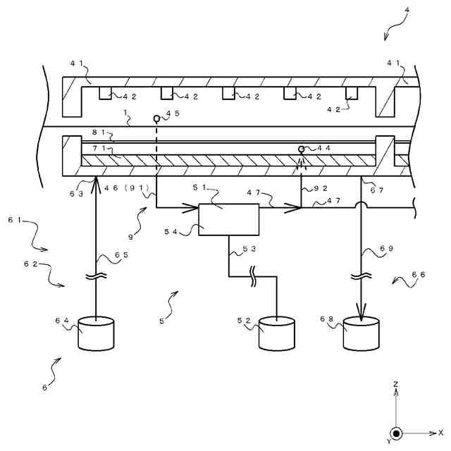 リチウムイオン電池は、ロールツーロールで搬送されるアルミ箔や、銅箔などのシート状の基材に対して、電極材料のスラリーを塗布して塗膜を形成し、形成した塗膜を乾燥させることで正極、負極が形成されている。なお、正極を形成する場合は、主にNMP(N‐メチル‐ピロリドン)を含有するスラリーが基材に塗布され、負極を形成する場合は、主に水を含有するスラリーが基材に塗布される。そして、塗膜の乾燥は、塗膜を加熱して塗膜に含まれる溶剤等を気化させることによって行われており、正極を形成する場合は塗膜から溶剤であるNMPが気化し、負極を形成する場合は塗膜から溶剤である水が気化するようになっている。なお、以下の説明では、NMPと水を区別する必要がない場合は、溶剤と呼ぶ。