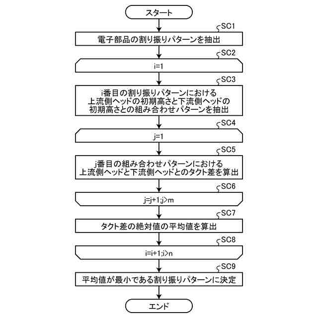 1枚の基板に実装する複数の電子部品Cのうち、前記第1実装ヘッド及び前記第2実装ヘッドのいずれかが実装するかの割り振りパターンを抽出することと、