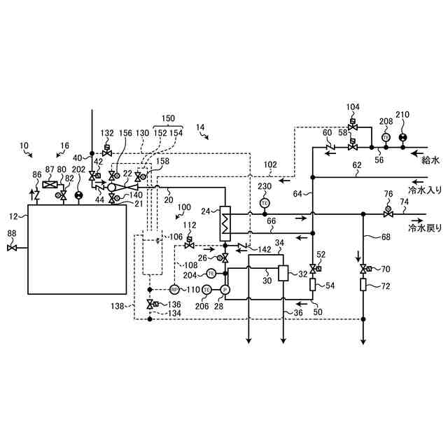 図1は、実施形態に係る真空冷却装置10を模式的に示す図である。図1に示す真空冷却装置10は、処理槽12と、真空装置14と、復圧ユニット16と、制御手段90と、洗浄装置100と、を含む。真空冷却装置10は、処理槽12に食品等の冷却対象を配置し、処理槽12を封止し、真空装置14で処理槽12内の流体を外部へ吸引して排出することで減圧する。処理槽12内に配置された冷却対象は、処理槽12内部が減圧されることで、冷却対象の水分が気化する。冷却対象は、水分が蒸発する気化熱で温度が低下する。真空冷却装置10は、処理槽12内部を減圧した後、復圧ユニット16で、処理槽12の内部に外気を導入して、外気と略同じ圧力とし、処理槽12の内部から冷却対象を取り出し可能とする。洗浄装置100は、真空装置14を洗浄する。