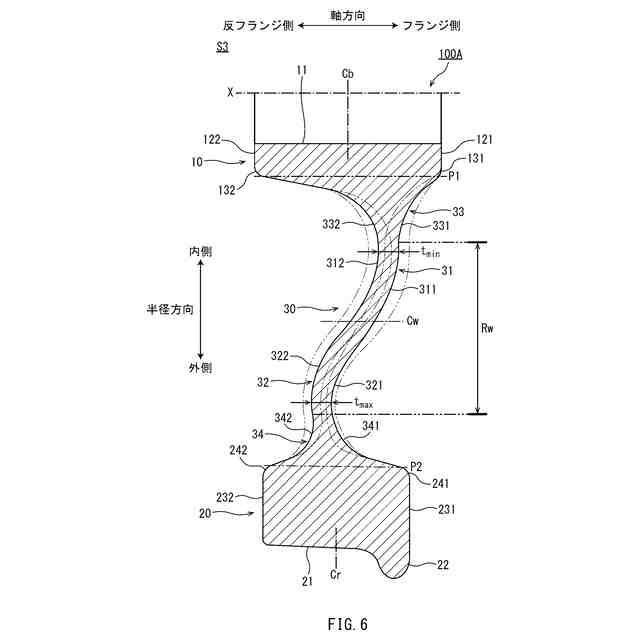 前記第2湾曲部の前記頂部が前記軸方向において最も前記フランジに近づく位置での前記車輪の前記中心軸を含む断面を第1断面、前記第2湾曲部の前記頂部が前記軸方向において最も前記フランジから遠ざかる位置での前記車輪の前記中心軸を含む断面を第2断面、前記円周方向において前記第1断面と前記第2断面との中間の位置での前記車輪の前記中心軸を含む断面を第3断面としたとき、少なくとも前記第1断面が前記板厚変化断面であり、