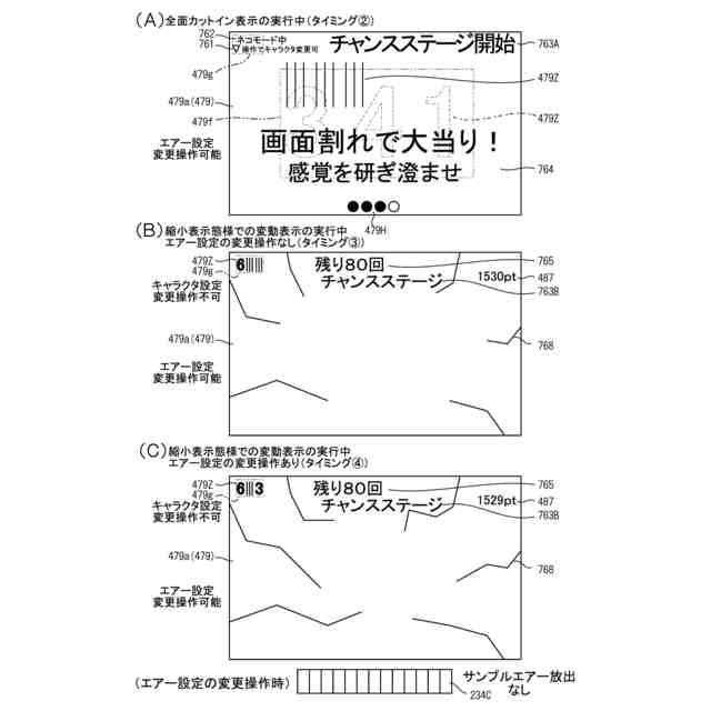 特別遊技状態における主人公キャラクタの動作が他のキャラクタからの作用に基づき変化可能な演出の実行中での制限数到達(図73(A)に示す制限数到達B)に基づく表示内容の変化を示す説明図