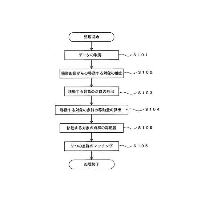 本発明において、前記第1のタイミングを含む特定の時間範囲において、前記第1の点群の対象に対する連続した複数回の撮影が行われ、前記連続した複数回の撮影によって得た複数の撮影画像に基づき、前記移動する対象の特定が行われる態様が挙げられる。本発明において、前記第1のタイミングと前記第2のタイミングの間における前記移動する対象の点群の変位量を算出する移動する点群の変位量算出部を備え、前記変位量に基づき、前記再配置が行われる態様が挙げられる。