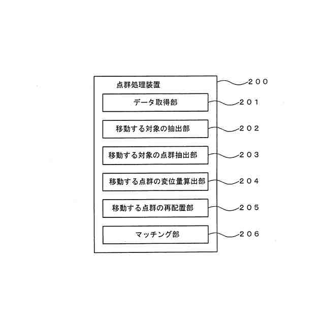 【解決手段】第1のタイミングで取得した第1の点群と、前記第1のタイミングと異なる第2のタイミングで取得した第2の点群とのマッチングを行う装置であって、前記第1の点群と前記第2の点群を取得するデータ取得部201と、前記第1の点群の中から移動する対象の点群を抽出する移動する対象の点群の抽出部203と、前記第1の点群における前記移動する対象の点群を前記第2のタイミングにおける位置に再配置する移動する点群の再配置部205と、前記第2の点群と前記再配置が行われた前記第1の点群とのマッチングを行うマッチング部206とを備える点群処理装置200。