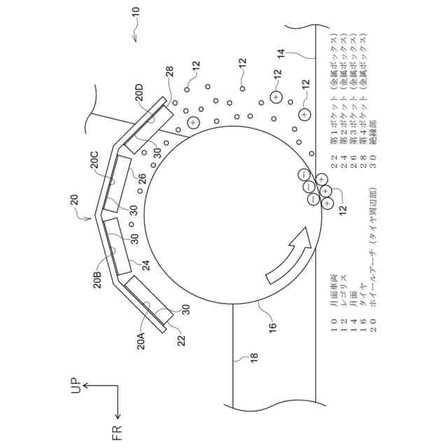 【解決手段】月面車両10は、車体において金属製のタイヤ16の周辺に位置するタイヤ周辺部20と、絶縁部30を介してタイヤ周辺部20に固定されると共に、開口部が形成され、タイヤ16によって巻き上げられたレゴリス12を当該開口部から取り込み堆積可能に構成された金属ボックス22、24、26、28と、を有する。