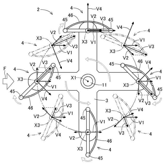 それぞれが前記第1軸心に平行な第3軸心回りに前記回転支持部材に対して回転自在となるように前記回転支持部材に支持され、流体の圧力により回転する複数の羽根体と、