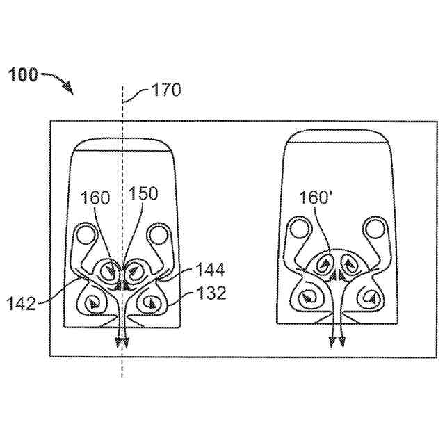 前記指状突起の第1の対は、前記第1のパワーノズルを画定し、前記指状突起の第2の対は、前記第2のパワーノズルを画定し、前記第1及び第2のパワーノズルのそれぞれは、前記少なくとも1つの入口に流体接続され、ジェットを前記中央部分の方へ噴出するように構成され、
