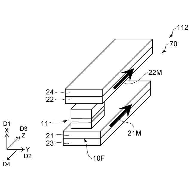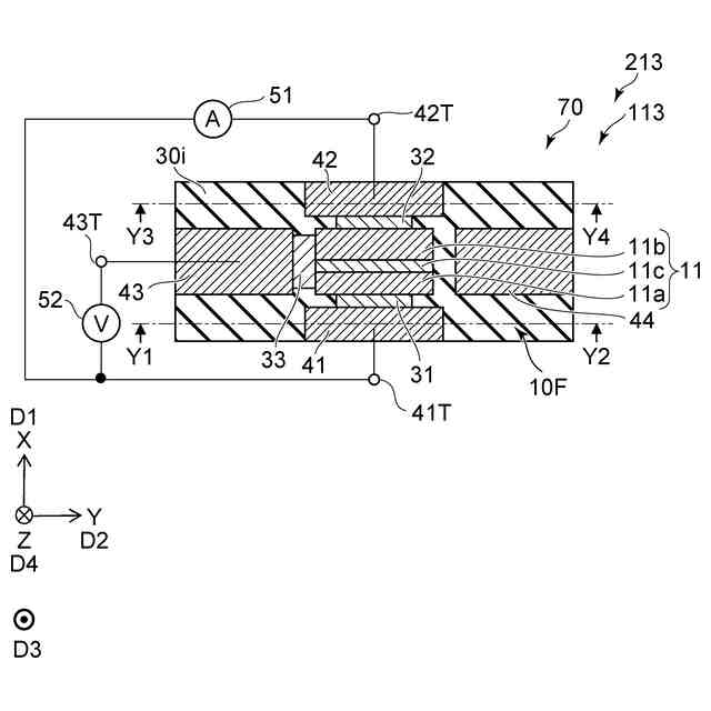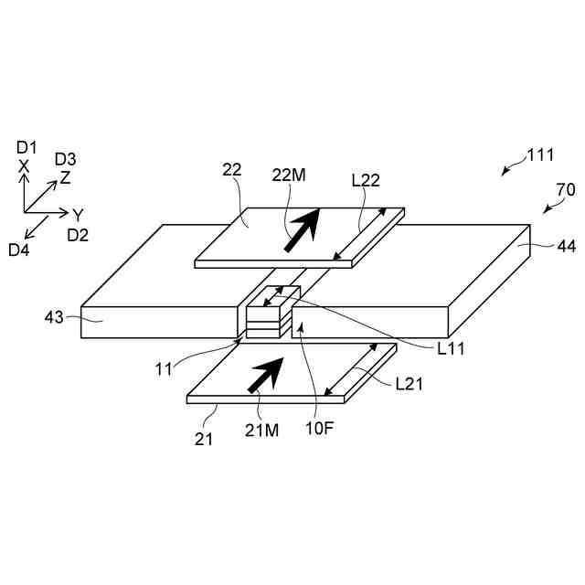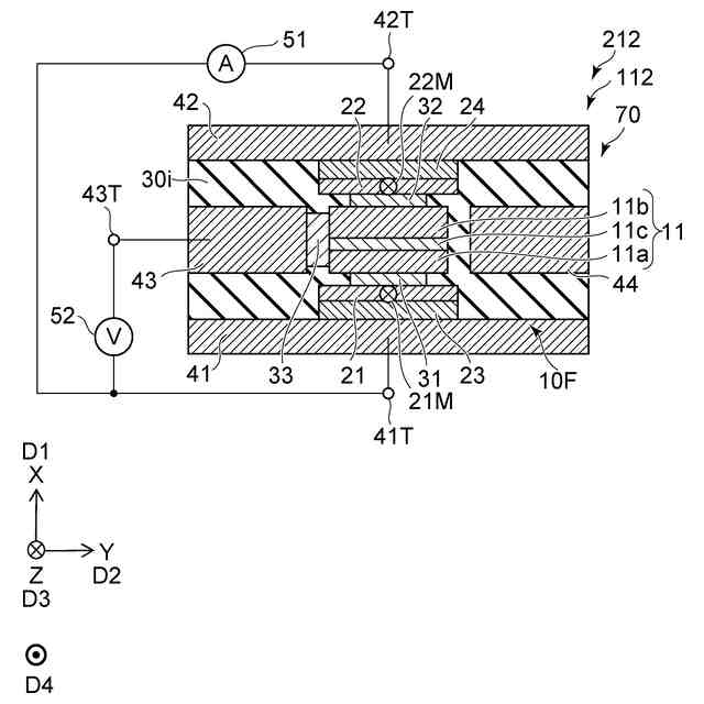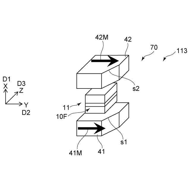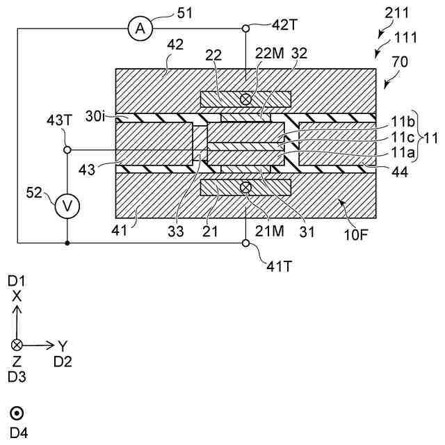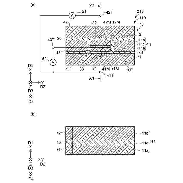 図2に示すように、再生部70は、媒体対向面10Fを含む。媒体対向面10Fは、磁気記録媒体80と対向する。媒体対向面10Fに沿う1つの方向をX軸方向とする。媒体対向面10Fに沿い、X軸方向に対して垂直な方向をY軸方向とする。X軸方向及びY軸方向に対して垂直な方向をZ軸方向とする。媒体対向面10Fは、Z軸方向と交差する。媒体対向面10Fは、例えば、後述する第1磁気素子11の1つの面で良い。図1(a)は、媒体対向面10Fから見た再生部70を例示している。