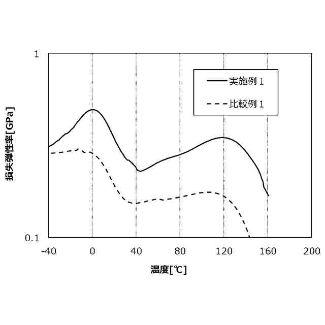図2は、本発明に係る実施例1、及び比較例1における温度と損失弾性率との関係を示す図である。