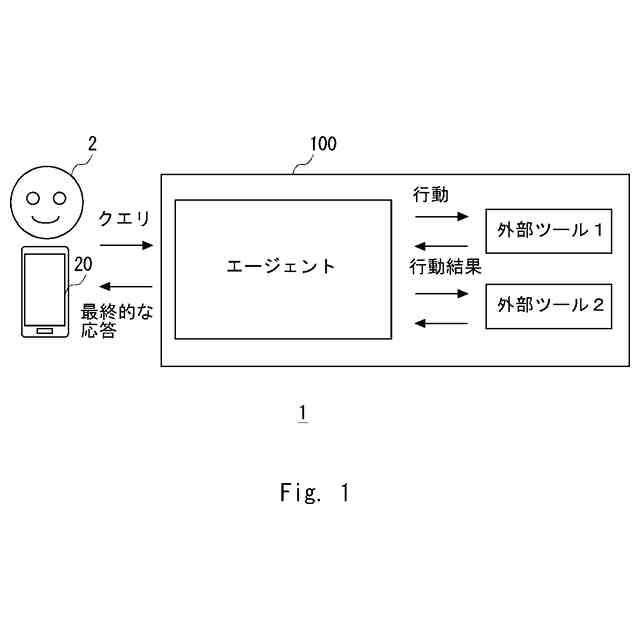 ユーザクエリに応答して外部ツールへのコマンドを出力する行動を含む複数の行動の列を出力するエージェントと、