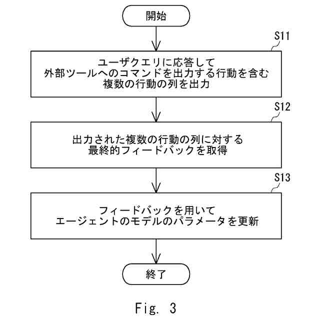 本開示に係るプログラムは、エージェントにより、ユーザクエリに応答して外部ツールへのコマンドを出力する行動を含む複数の行動の列を出力する処理と、出力された前記複数の行動の列に対する最終的フィードバックを取得する処理と、前記最終的フィードバックを用いて前記エージェントのモデルのパラメータを更新する処理と、をコンピュータにより実行させる。