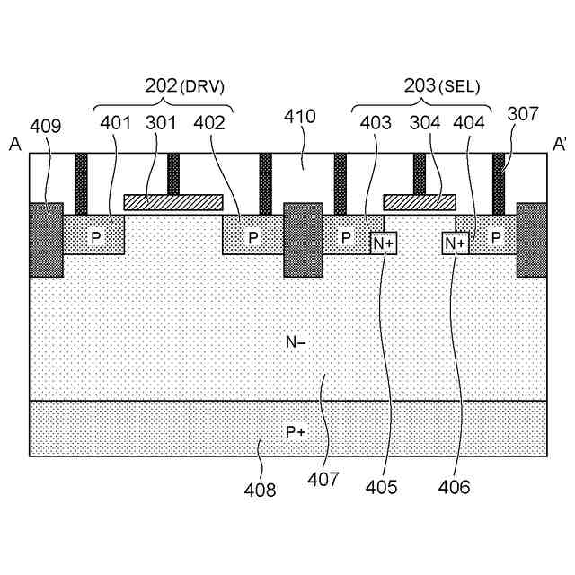 前記第5トランジスタは、前記ソース、前記ドレインの拡散領域に、Halo注入層を有し、前記Halo注入層は、前記拡散領域の極性と逆の極性であり、