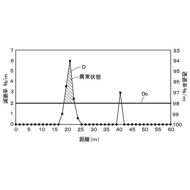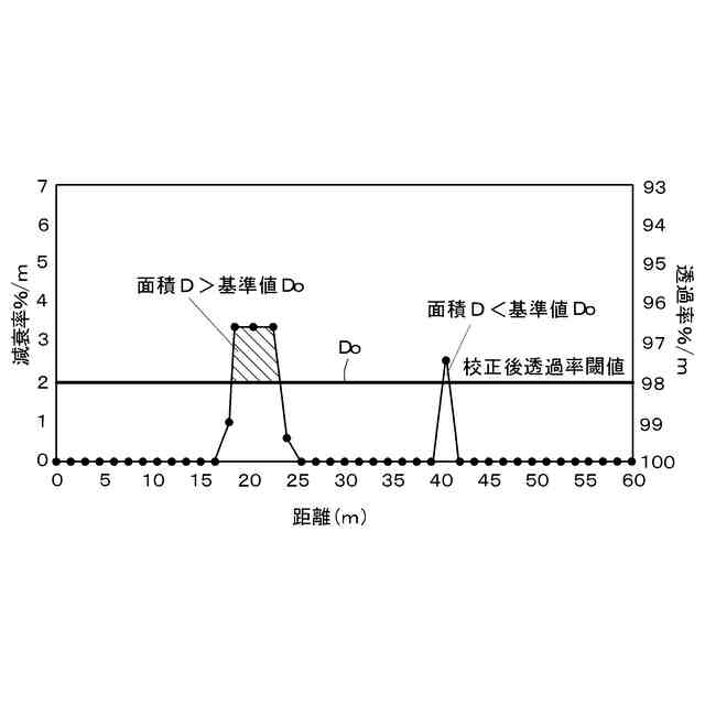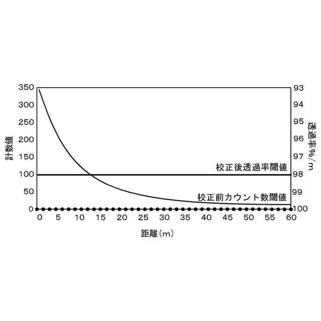 前記第1の線グラフは、多数回分の前記パルス光を含む集計時間の前記パルス光の受光に基づいて、曲線となる距離に応じた校正前計数閾値に対して、距離の2乗に比例する係数を乗じて距離に対して一定となる直線の閾値である校正後透過率閾値を有し、