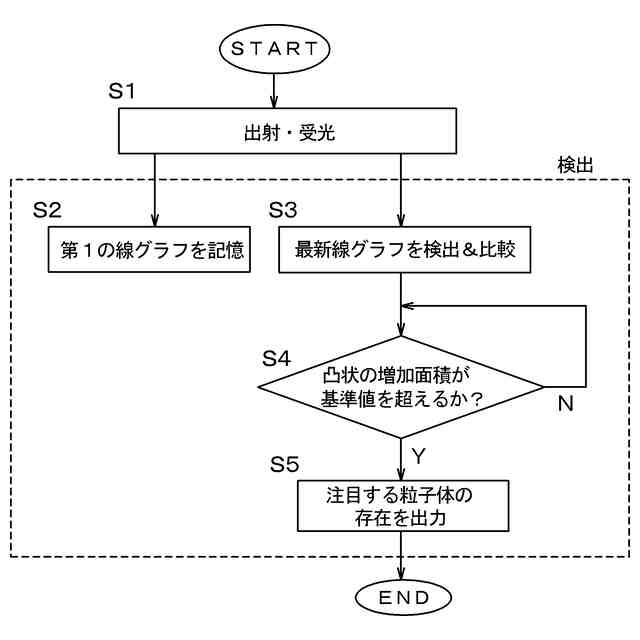 前記検出部は、基準となる第1の線グラフを記憶し、前記パルス光の出射から前記受光手段の受光までの時間差に基づき、前記注目粒子体までの距離を換算して、前記距離に応じた前記受光手段の反射光強度に基づく計数値に対して線グラフ化し、