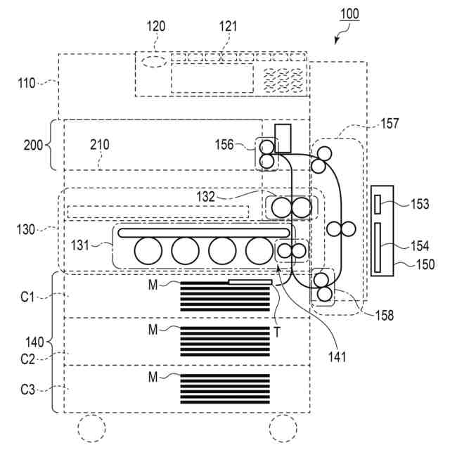 画像形成装置100は、例えば複合機である。画像形成装置100は、画像読取部110、コントロールパネル120、ディスプレイ121、画像形成部130、メディア収容部140、RFID処理部150、及びメディア受け取り部200を備える。