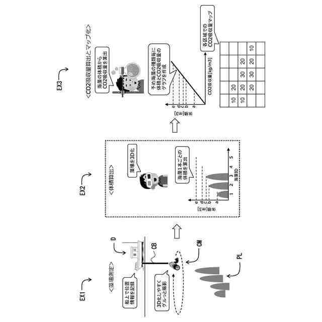 吸収量」として見積もっており、水生植物の分布は「藻場面積」として2次元分布で求めたものが利用されているに留まっている。水生植物は2次元平面的に分布するだけでなく、水中の深さ方向にも分布しており、3次元で水中内の占有体積をもって分布しているが、従来技術ではこの3次元分布を考慮できていなかった。