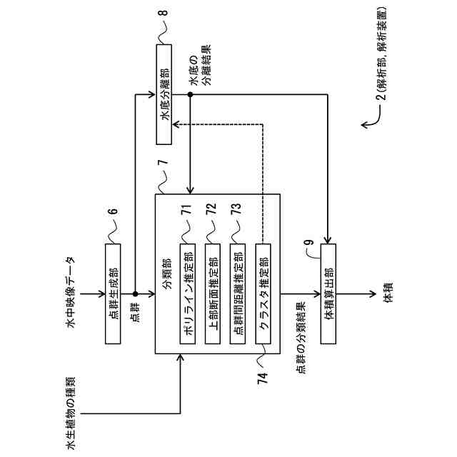【解決手段】水中の物体について計測されている点群に対して分類を適用し、水生植物が連続範囲を占める1物体としての個体が該当する各々の部分点群を得る分類部7と、前記部分点群の各々に対して、対応する水生植物が占める水中範囲の体積を算出する体積算出部9と、を備える