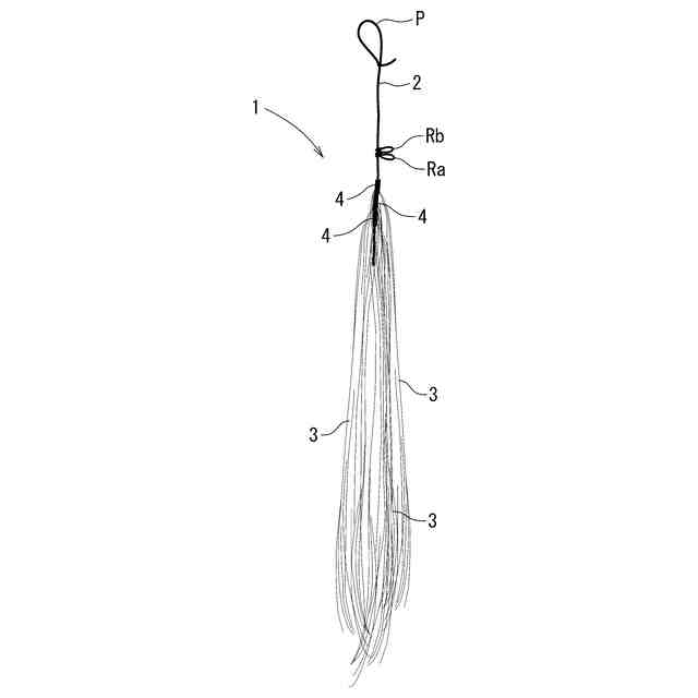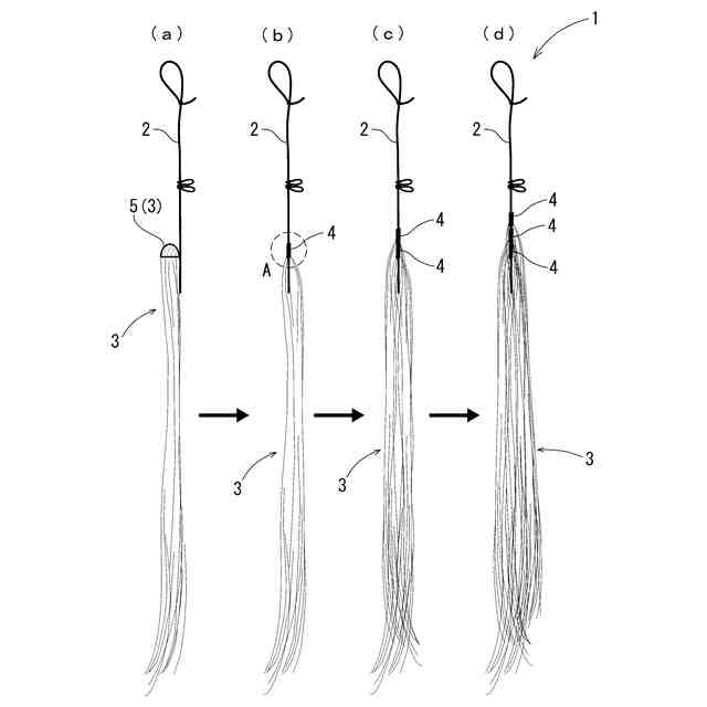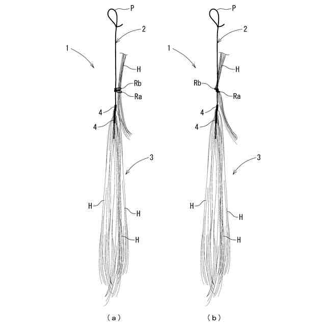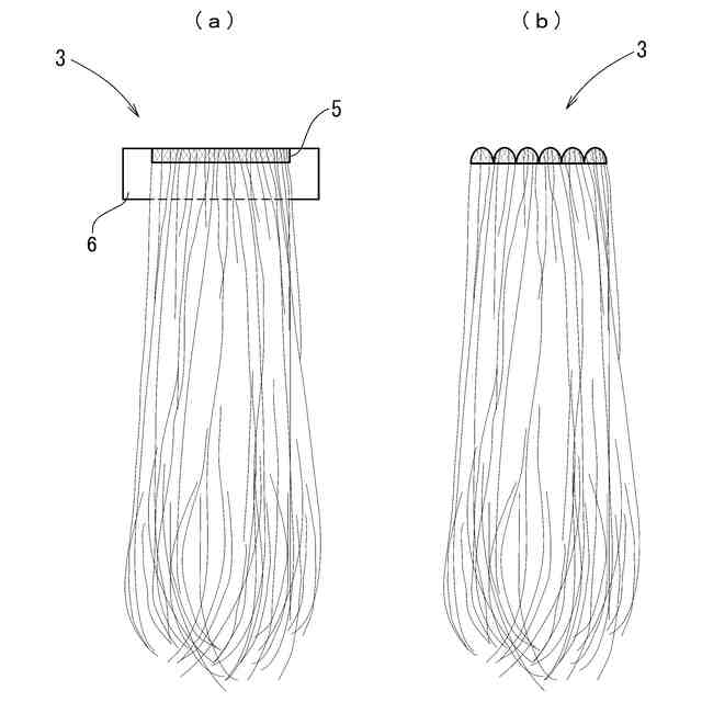 請求項2に記載された発明は、請求項1に記載された発明において、前記各毛髪の束の基端部分が、粘着剤によって繊維状の取付けベース線材に粘着されていることを特徴とするものである。