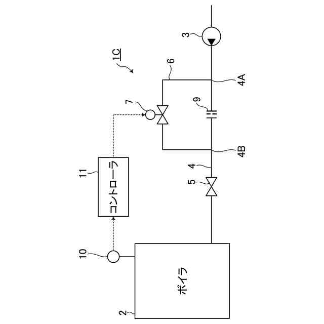 流体供給ライン4は、ボイラ2に接続される。流体供給ライン4にポンプ3が配置される。ポンプ3は、流体供給ライン4を介してボイラ2に水が供給されるように駆動する。