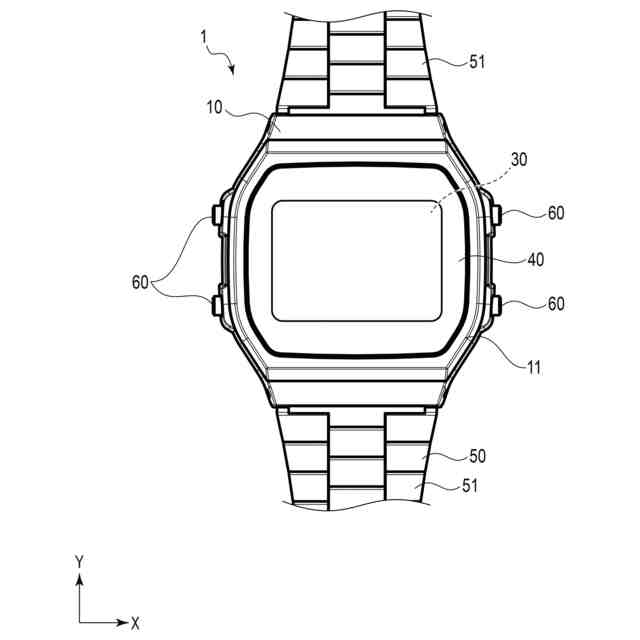 以下、本発明の第1実施形態にかかる時計1及びケース機器である時計ケース10の構成について、図1乃至図5を参照して説明する。例えば時計1は、一方向の一方側であって風防部材40の外面が向く方を表側とし、一方向の他方側であって裏蓋12の表面が向く方を裏側として、説明する。例えば時計1は裏側の外面が、装着対象である腕に対向する姿勢となる。図中X、Y、Zは互いに直交する三方向をそれぞれ示す。例えば本実施形態において、時計1は、Z軸に沿う第1方向が時計1の表裏方向に、X軸が時計1の3時と9時を結ぶ横方向に、Y軸が時計1の6時と12時を結ぶ縦方向に、それぞれ沿う姿勢を例として説明するが、これに限られるものではない。なお、各図において、適宜構成を拡大、縮小、省略して概略的に示す。