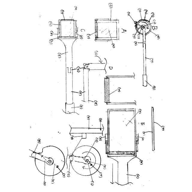 図面の名称 Aは湿布連続貼り機の正面図 Bは湿布連続貼り機の側面図 Cは湿布連続貼り機の上面図 Dは握り柄間接の図 Eは湿布連続貼り機の底面図 (ア)粘着ゴムロール (イ)粘着ゴム板(ポリイソプレン) (ウ)仕切山(凸ばり) (エ)ジョイント(間接) (オ)プラスチック (カ)歯車 (キ)柄の握り (ク)湿布の表布 (ケ)セロハン(ビニール)膜 (コ)発条(バネ) (サ)アーム (シ)固定回転軸 (ス)腕木 (セ)発条止点線で表す (ソ)矢印は動きを表す (タ)点線は腕を表す (チ)回転車