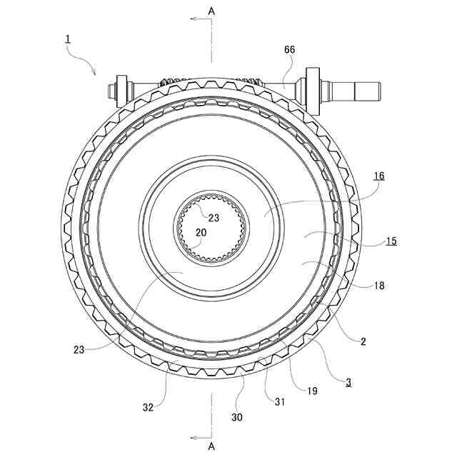 駆動カム106aは、軸方向他方側の側面に駆動側カム面106a1を有し、かつ、外周面にギヤ部106a2を有する。駆動カム106aは、入力部材101の周囲に、該入力部材101に対する相対回転および軸方向の変位を可能に配置されている。