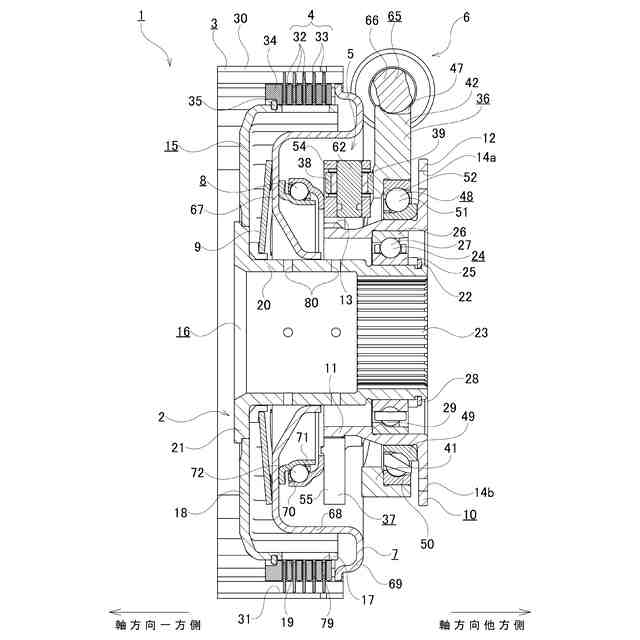 図27および図28は、国際公開第2008/096438号に記載のクラッチ装置100を示している。クラッチ装置100は、入力部材(後輪用出力軸)101と、出力部材(スプロケット)102との間に配置されて、入力部材101と出力部材102との間でトルクを伝達する接続モードと、トルクを伝達しない切断モードとを切り換える。クラッチ装置100は、第1部材103と、第2部材104と、摩擦係合部105と、カム装置106と、電動アクチュエータ107と、押圧部材108と、転がり軸受109と、弾性部材110と、荷重検出部111とを備える。