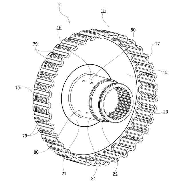 摩擦係合部105は、軸方向に交互に重ね合わされた複数枚ずつの第1摩擦板105aと第2摩擦板105bとを備える。それぞれの第1摩擦板105aは、第1部材103の大径筒部103cに対して、軸方向の変位を可能に、かつ、相対回転を不能に外嵌されている。それぞれの第2摩擦板105bは、第2部材の円筒部104bに対して、軸方向の変位を可能に、かつ、相対回転を不能に内嵌されている。