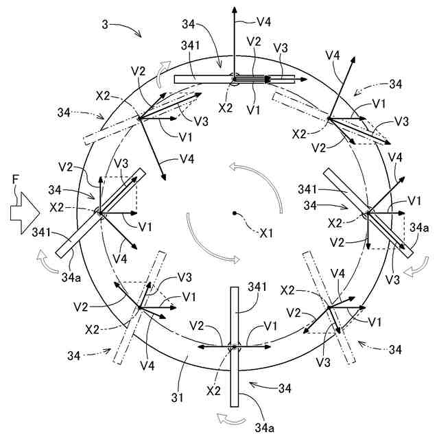 一対の前記回転体のそれぞれは、前記第1軸心に直交する方向に沿う流体の流れを受けて回転するように構成され、