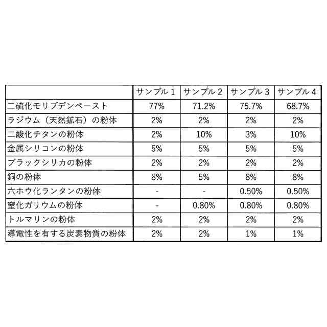 本発明の前記目的は、放射性物質を含有する天然鉱物の粉体と、前記天然鉱物から放出されるアルファ線により電子を発生させる電子発生物質の粉体とを備えており、前記電子発生物質の粉体は、二酸化チタンの粉体と、金属マグネシウムの粉体と、金属シリコンの粉体と、ブラックシリカの粉体と、六ホウ化ランタンの粉体と、銅の粉体とを備えることを特徴とする摩擦抵抗を低減させる物質活性化素材により達成される。