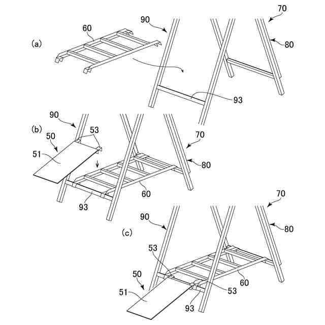 立て看板用スロープ10は、看板本体と支持体との間に架設される架設部20とスロープ部30とを折曲自在に接続した一体型となっている。