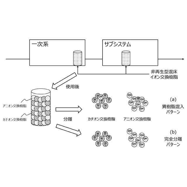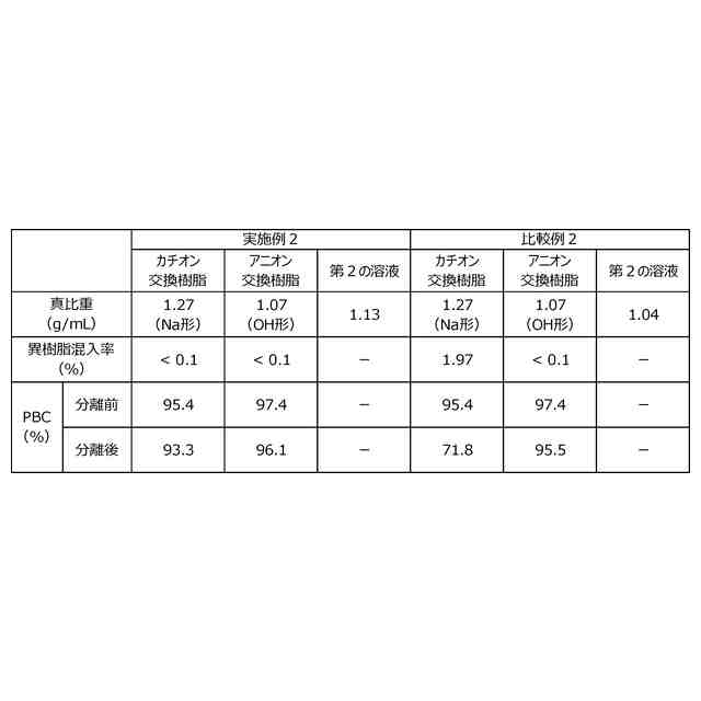 使用済みの混床イオン交換樹脂に含まれるカチオン交換樹脂とアニオン交換樹脂とを分離する方法として、1.樹脂のイオン形を変換することによる分離、2.表面処理を行うことによる分離、および3.飽和塩水を用いた比重による分離(特許文献1)などの方法が検討されている。