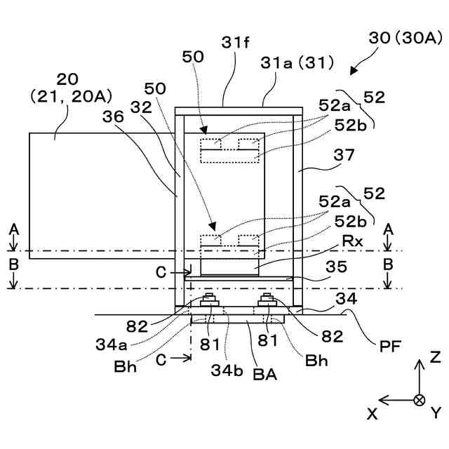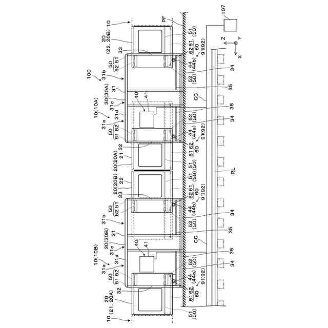 図1は、ホーム柵100を説明する概念図である。図1は、ホーム柵100をプラットホームPF側から見た図であり、ホーム柵100のプラットホームPF側の外装パネルを除いた状態を示す。本明細書において、ホーム柵100のプラットホームPF側は、ホーム柵100の裏面側であるとする。