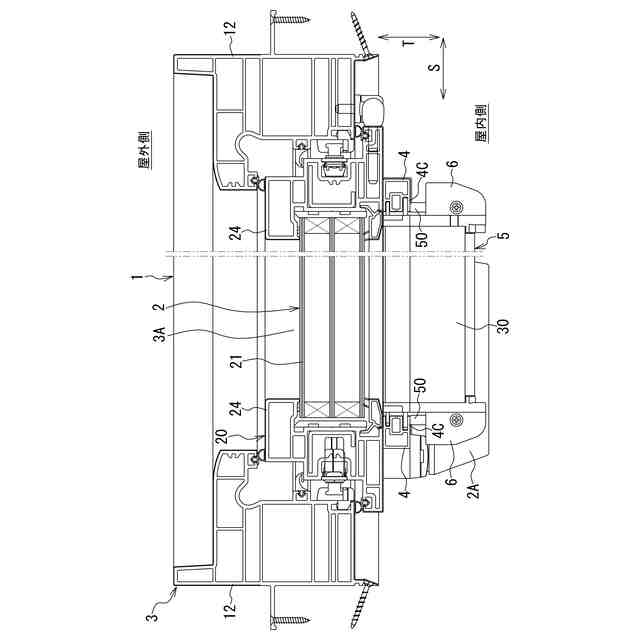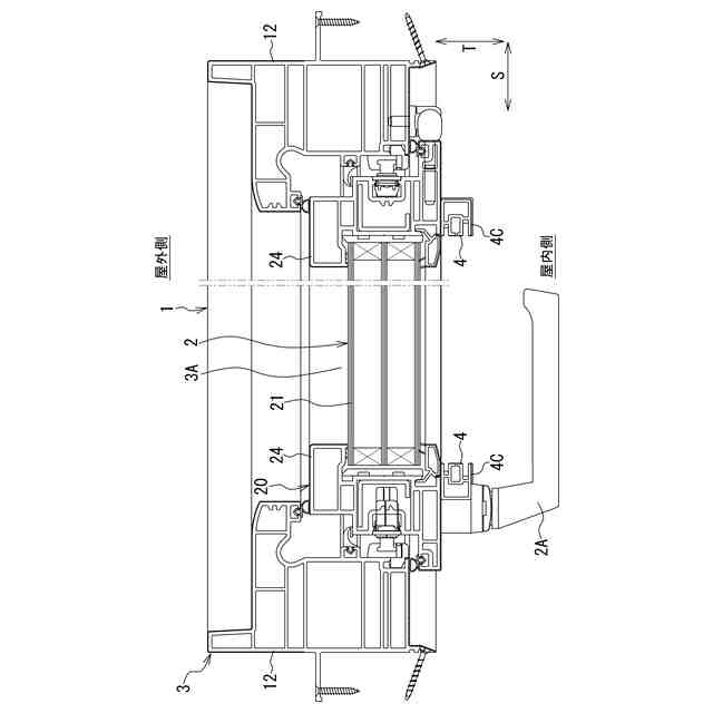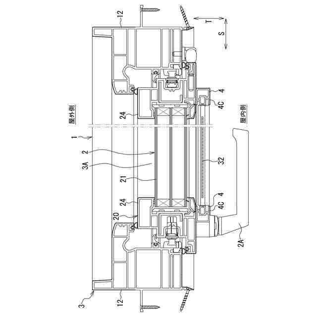 図1は、第1実施形態の建具1を示す斜視図であり、図2は、第1実施形態の建具1を示す正面図である。図1、図2では、建物に設置された建具1を屋内側からみて示している。図3は、図2のX1-X1線で切断した第1実施形態の建具1を示す縦断面図であり、上下方向Rと屋内外方向Tを含む面で切断した建具1の断面を示している。図4は、図2のX2-X2線で切断した第1実施形態の建具1を示す横断面図であり、左右方向Sと屋内外方向Tを含む面で切断した建具1の断面を示している。