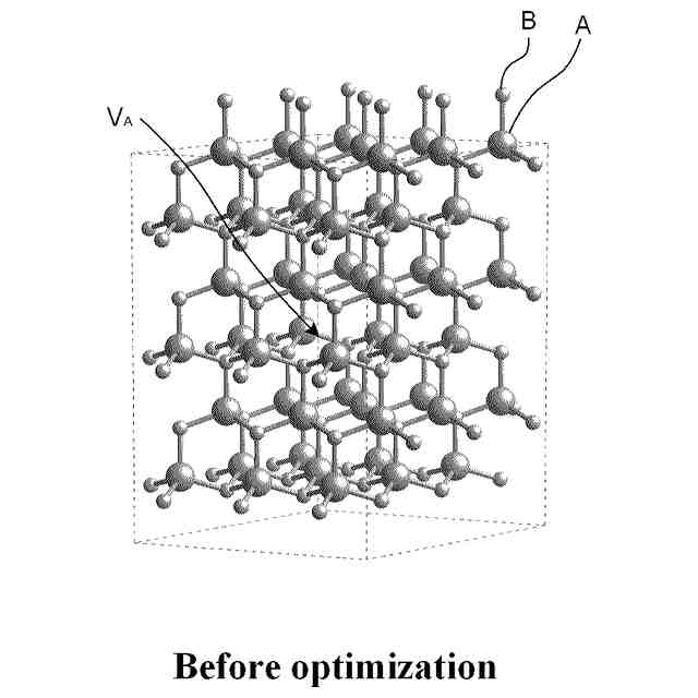 図2に示す強磁性体の結晶構造を、格子欠損VAによる結晶場分裂に基づき最適化した結果となる結晶構造を示す図である。