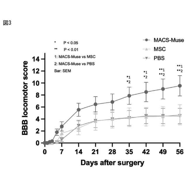 公開番号2025123077 公報種別公開特許公報(A) 公開日2025-08-22 出願番号2024018939 出願日2024-02-09 発明の名称脊髄梗塞治療のための多能性幹細胞 出願人国立大学法人東北大学 代理人個人,個人,個人,個人,個人,個人 主分類A61K 35/28 20150101AFI20250815BHJP(医学または獣医学;衛生学) 要約【課題】再生医療において、多能性幹細胞(Muse細胞)を用いた新たな医療用途を提供することを目的とする。 【解決手段】本発明は、生体の間葉系組織又は培養間葉系細胞から分離されたSSEA-3陽性の多能性幹細胞を含む、脊髄梗塞を治療し、予防し、軽減し及び/又は発症を遅延させるための細胞製剤及び医薬組成物を提供する。本発明は、脊髄梗塞を有する対象に対し、Muse細胞を投与することにより、脊髄梗塞部位の組織に生着させ、脊髄梗塞を治療等する機構に基づく。 【選択図】なし 特許請求の範囲【請求項1】 生体の間葉系組織又は培養間葉系細胞から分離されたSSEA-3陽性の多能性幹細胞を含む、対象における脊髄梗塞を治療し、予防し、軽減し及び/又は発症を遅延させるための細胞製剤。 続きを表示(約 810 文字)【請求項2】 外部ストレス刺激によりSSEA-3陽性の多能性幹細胞が濃縮された細胞画分を含む、請求項1に記載の細胞製剤。 【請求項3】 MACS及び/又はFACSによりSSEA-3陽性の多能性幹細胞が濃縮された細胞画分を含む、請求項1に記載の細胞製剤。 【請求項4】 多能性幹細胞がCD105陽性である、請求項1~3のいずれか1項に記載の細胞製剤。 【請求項5】 多能性幹細胞がCD117陰性及びCD146陰性である、請求項1~3のいずれか1項に記載の細胞製剤。 【請求項6】 多能性幹細胞が、CD117陰性、CD146陰性、NG2陰性、CD34陰性、vWF陰性、及びCD271陰性である、請求項1~3のいずれか1項に記載の細胞製剤。 【請求項7】 多能性幹細胞が、CD34陰性、CD117陰性、CD146陰性、CD271陰性、NG2陰性、vWF陰性、Sox10陰性、Snai1陰性、Slug陰性、Tyrp1陰性、及びDct陰性である、請求項1~3のいずれか1項に記載の細胞製剤。 【請求項8】 多能性幹細胞が、以下の性質の全てを有する多能性幹細胞である、請求項1~3のいずれか1項に記載の細胞製剤: (i)テロメラーゼ活性が低いか又は無い; (ii)三胚葉のいずれかの胚葉の細胞に分化する能力を持つ; (iii)腫瘍性増殖を示さない;及び (iv)セルフリニューアル能を持つ。 【請求項9】 脊髄梗塞が、運動機能障害、感覚障害、又は膀胱直腸障害である、請求項1~3のいずれか1項に記載の細胞製剤。 【請求項10】 多能性幹細胞が脊髄梗塞部位の組織内に生着する能力を有する、請求項1~3のいずれか1項に記載の細胞製剤。 (【請求項11】以降は省略されています) 発明の詳細な説明【技術分野】 【0001】 本発明は、再生医療のための細胞製剤に関する。より具体的には、本発明は、多能性幹細胞を含む、対象における脊髄梗塞の治療、予防、軽減及び/又は発症の遅延のために有効な細胞製剤に関する。 続きを表示(約 10,000 文字)【背景技術】 【0002】 大動脈手術の周術期合併症である対麻痺は、脊髄虚血性障害、若しくは脊髄虚血再灌流障害が原因であり、脊髄梗塞がその主病態である。下肢運動機能低下に加え、感覚障害や膀胱直腸障害を生じ、生活の質を低下させ生命予後にも大きな影響を与える。その胸腹部大動脈手術における対麻痺発生率は、手術経験豊富な施設においても、胸腹部大動脈人工血管置換術で8.3%(非特許文献1)、胸腹部大動脈ステントグラフト治療で11%(非特許文献2)と報告されている。術前画像診断技術や術中モニタリング技術の劇的な進歩と相反して、脊髄障害発症率は過去10年間で大きな改善は見られていない。脳脊髄液ドレナージ(非特許文献3)、permissive hypertension、ステロイドやナロキソン等の薬剤投与などが治療として選択されるが、治療効果は限定的であり、確立された治療方法は存在しない。 【0003】 これまでに脊髄虚血性障害に対する間葉系幹細胞(mesenchymal stem cell;MSC)を用いた実験的研究の治療効果は数多く示されているが、いずれも短期間の観察に留まるものしかなく、治療機序としてはパラクライン効果や抗炎症効果によるとされる(非特許文献4~10)。Multilineage-differentiating stress enduring(Muse)細胞はヒト生体内に内在する新たな多能性幹細胞として2010年に報告された(非特許文献11)。Muse細胞は成人のあらゆる結合組織や血液、骨髄に存在し、多能性マーカーであるSSEA-3(stage-specific embryonic antigen-3)によって同定可能である(非特許文献12)。胚性幹(Embryonic stem;ES)細胞や人工多能性幹細胞(induced-pluripotent stem;iPS)細胞と異なり、生体内に存在するため腫瘍性は示さない。さらに,Muse細胞は血管内投与のみでスフィンゴシン-1-リン酸(S1P)を伝達物質として認識して障害組織に遊走し(非特許文献13)、アポトーシスを起こした細胞を貪食することにより自発的に組織特異的な細胞へと分化することで組織修復をもたらす(非特許文献14)。過去の心筋梗塞モデル(非特許文献13)、脳梗塞モデル(非特許文献15)、大動脈瘤モデル(非特許文献16)、腎不全モデル(非特許文献17)、