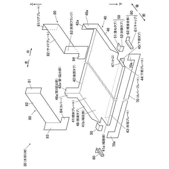 以上のような請求項2によれば、第1延出部(42a)が第2見付け面(5c)に突き当てられて第2見付け面(5c)に固定されることは、外壁(1)への浸水の防止と、サッシ(10)と水切り材(30)の一体性の向上とに寄与する。第1延出部(42a)と第2延出部(46a)がこれらによって封止される角を成すことは、外壁(1)への浸水の防止に貢献する。