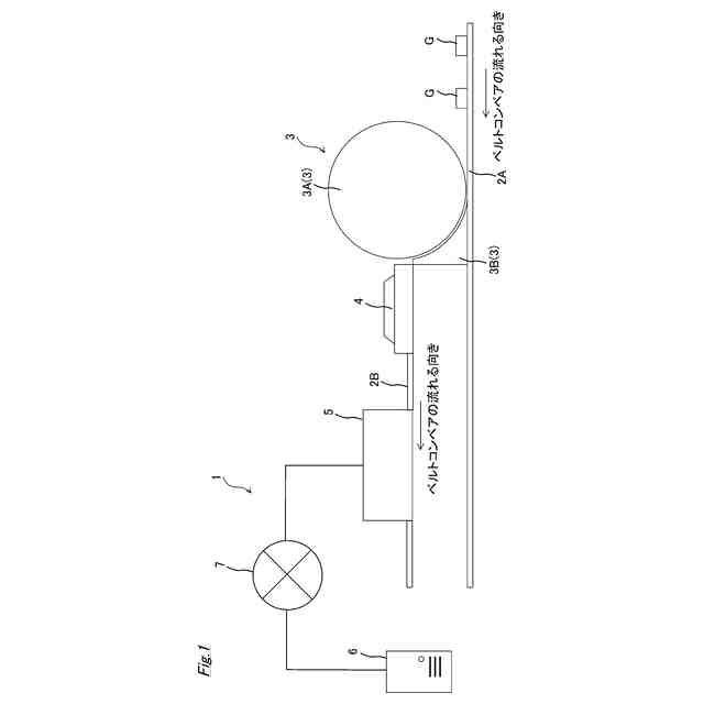図1は、本実施形態に係るゴミ分別システム1の構成の一例を示す図である。図1に示すように、ゴミ分別システム1は、既存のベルトコンベア2A上のゴミGを、既存のベルトコンベア2A上に配置された新設ベルトコンベア2Bと同じ高さまで持ち上げるための持ち上げ機構3と、ゴミGを整列させて搬送経路である新設ベルトコンベア2B(以下、単に搬送経路2Bともいう)へと排出する整列装置4と、2以上の搬送経路2B上のそれぞれに配置され、排出されたゴミGを分別する分別装置5と、通信網7により分別装置5に通信可能に接続されたサーバ6(情報処理装置)と、を備える。なお、本実施形態では、ゴミとして所定の大きさの固体、例えば、ビン、缶、ペットボトルなどを想定しているが、ゴミはこれらに限られない。