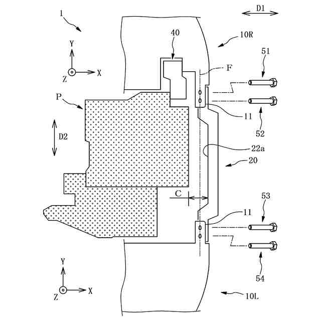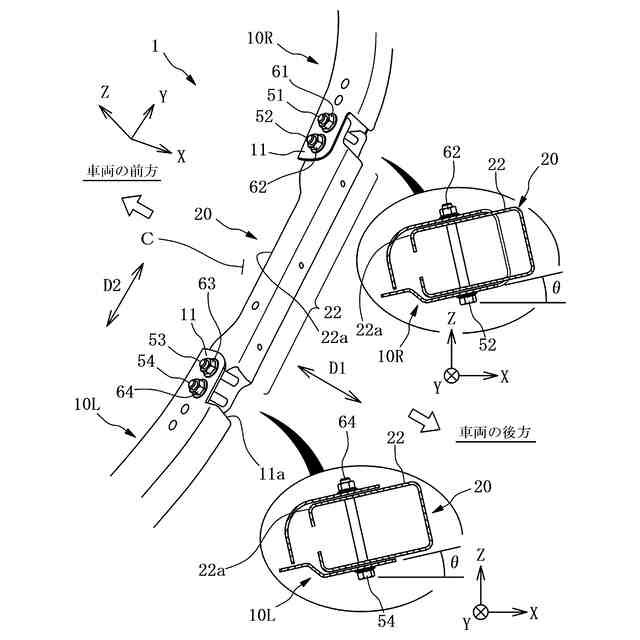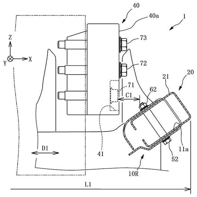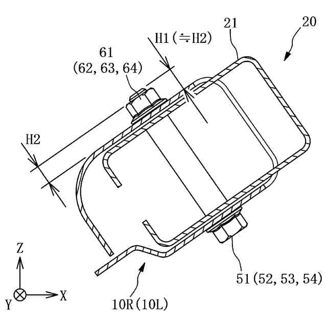車両100は、図1に示すように、電動パワートレインP、後輪T、リアサスペンションメンバ1、及び、その他の自動車部品を備える。電動パワートレインPは、電動モータと、変速機と、インバータとを含み、後輪Tを駆動するために用いられる。車両100は、例えば、電動パワートレインPに加えて、前輪を駆動するためのガソリンエンジンを備えるハイブリッド車である。しかしながら、これに限られない。車両100は、ハイブリッド車以外のものであってもよい。