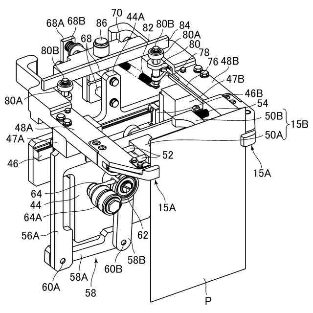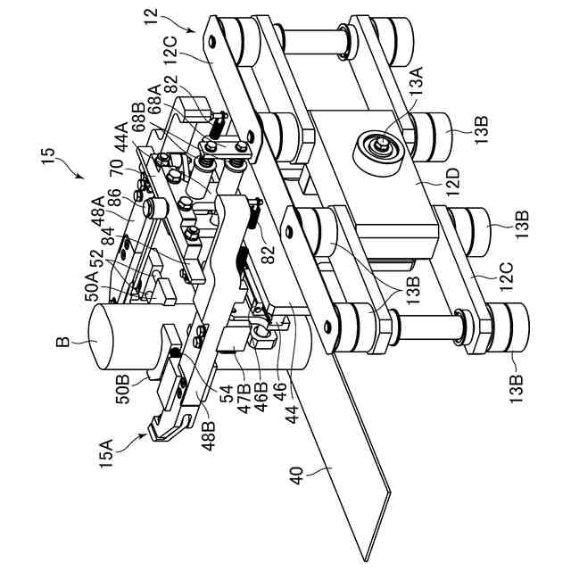図1、図2に示されるように、本実施形態の容器処理システム10は、例えば垂直軸周りに回転する2つのスプロケット12A、12Bに無端チェーン12Cが掛け回される搬送コンベヤ(移動手段)12を備える。無端チェーン12Cの外周部には、経路に沿って所定間隔で本実施形態のパウチ・ボトル兼用グリッパ(保持手段)15が多数設けられる。搬送コンベヤ12では、処理対象となるパウチPまたはボトルBがパウチ・ボトル兼用グリッパ15により保持され、無端状の循環経路に沿って間欠搬送される。パウチPまたはボトルBは後述するように所定数(4個)を単位に間欠搬送され、搬送中に充填、シーリング、キャッピングなどが適宜行われる。