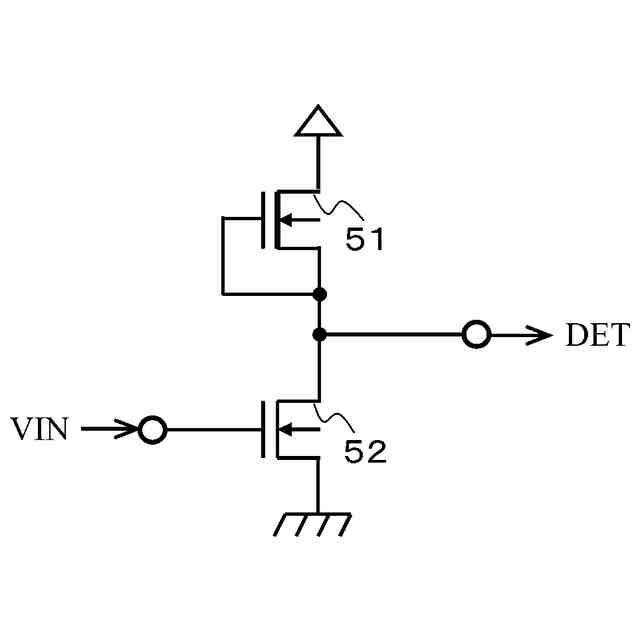 入力端子に入力される電圧VINが低く、NMOSトランジスタ52がオフしている時は、出力端子から出力される検出信号DETはHighレベルとなっている。電圧VINが上昇すると、検出信号DETはHighレベルからLowレベルに変化する。この時の電圧VINを電圧検出器の検出電圧と呼ぶ。検出電圧は、NMOSトランジスタ52の閾値電圧をVt