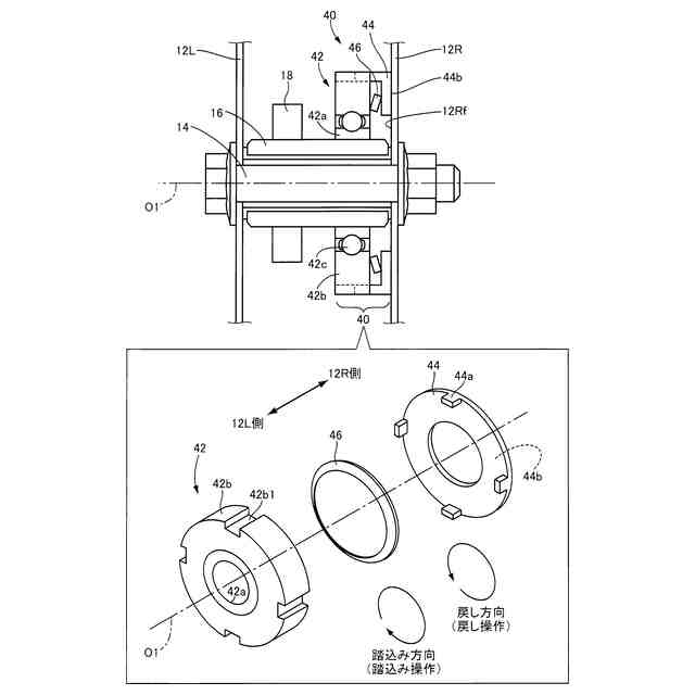 図1のクラッチペダルが備える一方向制動機構の構成及び作動を説明する図である。