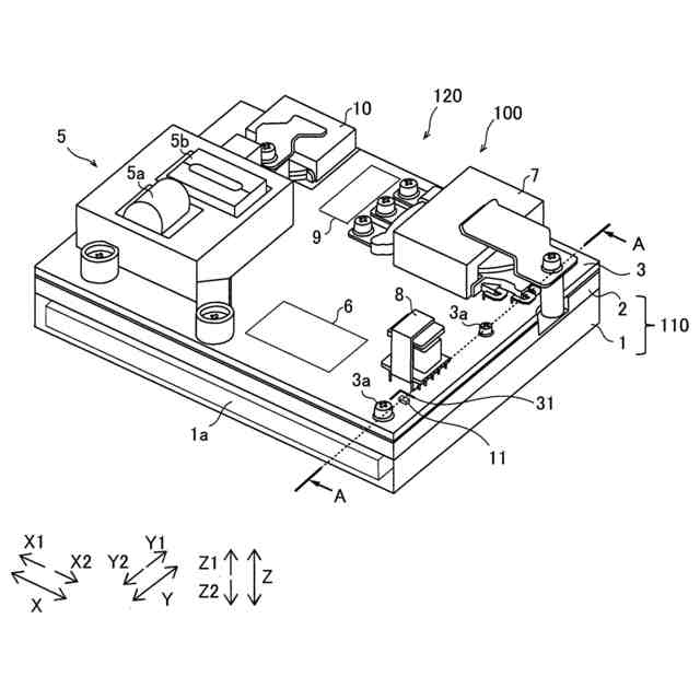 【解決手段】冷却流路1aを含む基台部110と、直流電源から入力される直流電力を変圧するコンバータ部120と、基台部110に形成された冷却流路1aに流れる液体の温度を検出する温度検出部11と、基台部110の冷却流路1aが形成されるZ2方向側とは反対のZ1方向側に積層して設けられた回路基板4とを備え、回路基板4において、基台部110とは反対のZ1側の面にはコンバータ部120が配置され、基台部110に対向するZ2側の面には温度検出部11が配置されている。