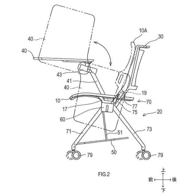 従来、椅子を使用しない場合に複数の椅子がコンパクトに収納できるように、前後に重ねること(いわゆるネスティング)ができるように脚部などを構成する場合がある。ネスティング可能な椅子に対して特許文献1及び特許文献2に開示の椅子のようなカップホルダを備えていると、カップホルダが干渉することでネスティングの際に椅子が十分に接近できず、前後方向の幅が大きくなってしまう恐れがある。