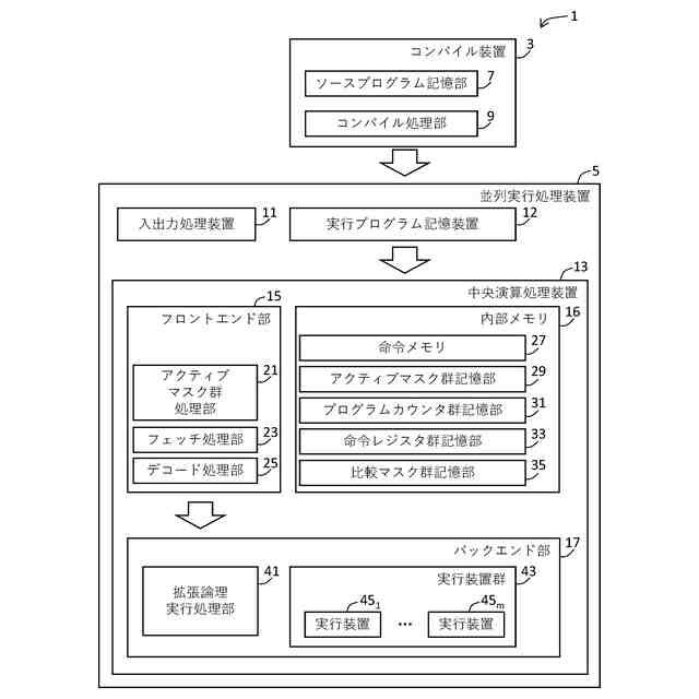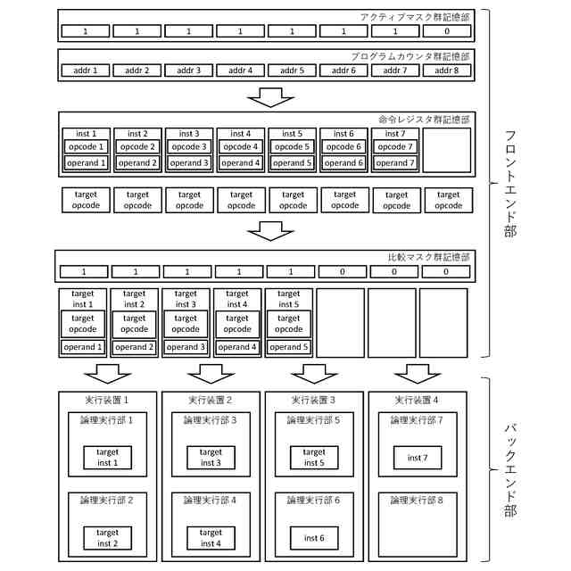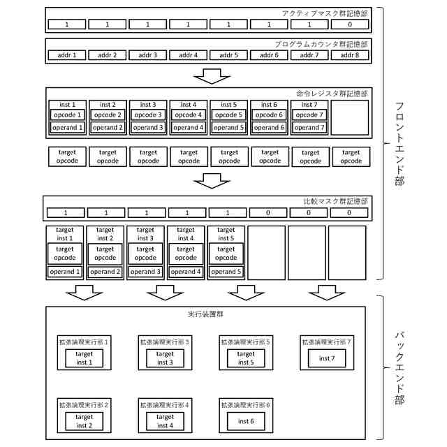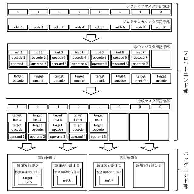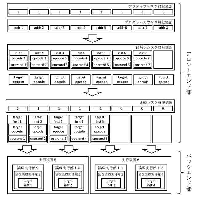 【解決手段】 複数の命令の並列に実行する中央演算処理装置13において、フェッチ処理部23は、プログラムカウンタ群記憶部31に含まれる複数のプログラムカウンタを利用して、複数の命令を命令レジスタ群記憶部33に一括して読み取る。デコード処理部25は、命令レジスタ群記憶部33に読み取られた複数の命令をデコード処理して、バックエンド部17に実行指示する。拡張論理実行処理部41は、実行装置群43に含まれる一つ又は複数の実行装置45において実行指示された命令を実行する。