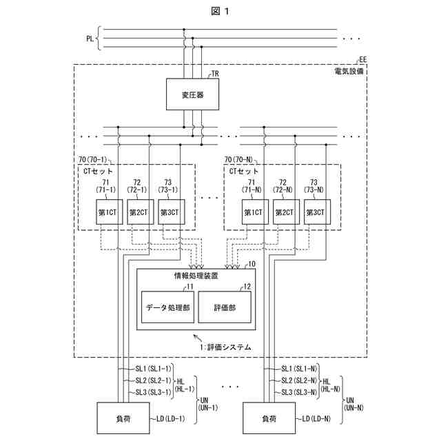 図1は、実施形態1における評価システム1およびその周辺の構成を例示している。評価システム1は、情報処理装置10を有している。図1の例では、情報処理装置10は、電気設備EEの内部に位置している。図1では、電気設備EEとして配電設備が例示されている。図1の例では、負荷LDは電気設備EEの外部に位置している。