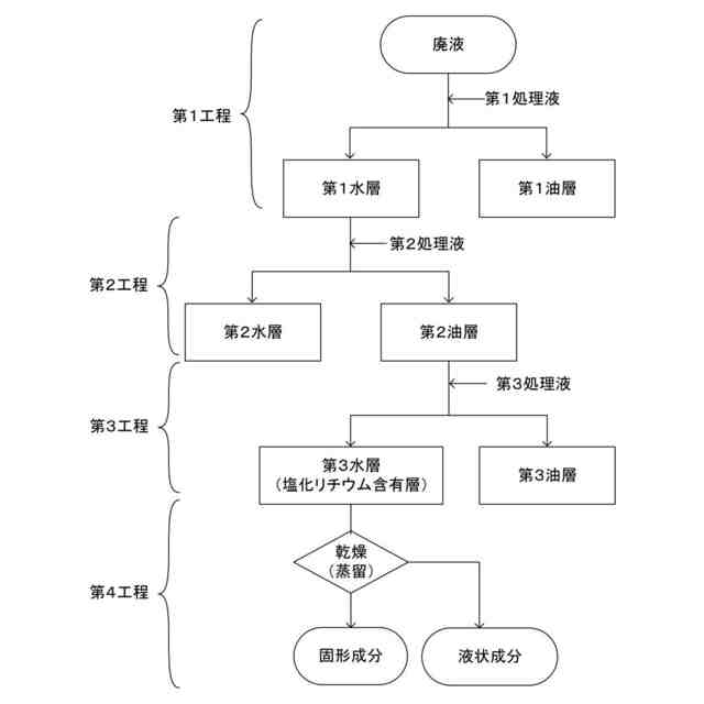 上記廃液に第1処理液を添加して、上記廃液を第1油層と、リチウムイオンを含有する第1水層とに分離し、上記第1水層を回収する、第1工程と、