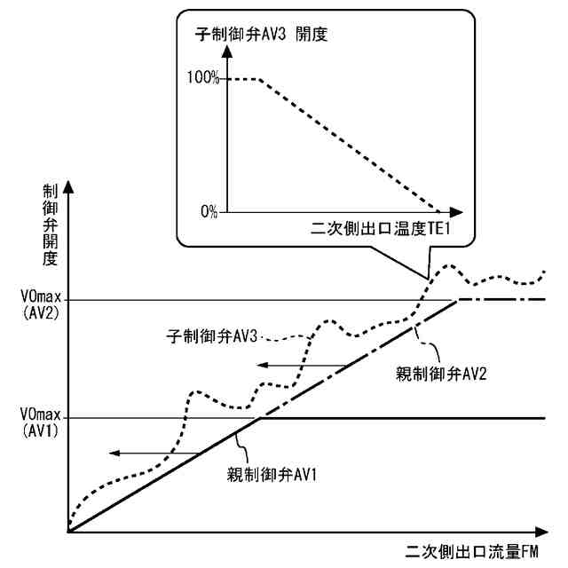 第3の観点は、第1または第2の観点に加えて、次の特徴をさらに有する。親制御弁が2個以上設けられる。これにより、熱交換器の二次側流体の流量が比較的短時間で大きく変動しても、親制御弁が1個設けられる場合と比較して、親制御弁の開度が、流量制御が有効な開度範囲内に収まりやすくなる。さらに、制御装置が、先行の親制御弁の開度が予め設定した上限開度に到達し、後行の親制御弁の開度制御を開始する際に、先行の親制御弁の開度を前記上限開度に維持することで、一次側流体の流量の乱れを抑制することができる。