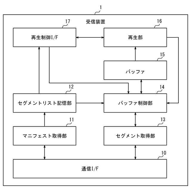 【解決手段】受信装置1は、受信したマニフェストファイルを解析し、メディア識別子ごとに前記セグメントの再生時刻及びURLを対応付けたセグメントURLリストを生成するマニフェスト取得部11と、メディアコンポーネントの切替指示を受け取ると、現在再生時刻に所定のバッファ規定値を加えたバッファ時刻を再生時刻の範囲に含むセグメントがバッファ15内に存在する場合には、セグメントURLリストから、メディアコンポーネントの切替後の切替後メディア識別子において、再生時刻の範囲にバッファ時刻を含むセグメントのURLを抽出するバッファ制御部14と、バッファ制御部14により抽出されたURLに基づいてセグメントを取得するセグメント取得部13と、を備える。