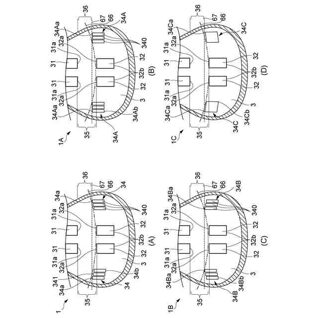 (A)~(D)は変形例に係わる吸収性物品の非肌側面からみた部分拡大平面図である。