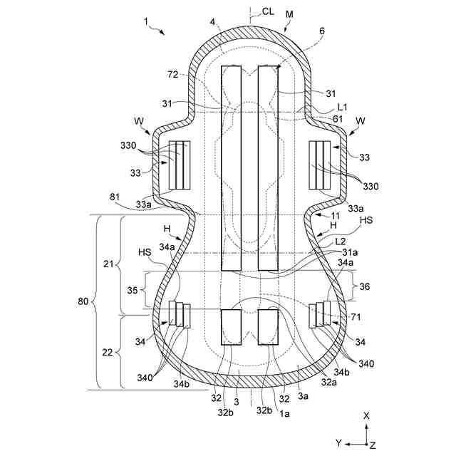 着用者の歩行動作によって吸収性物品に加わる力について説明する吸収性物品の平面図である。
